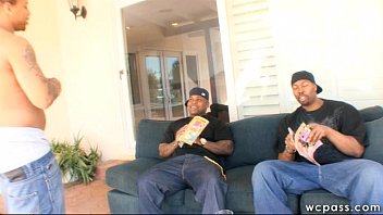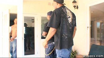Узнав. что местная шалава с большими сиськами сейчас дома, три негра закатываются к ней в дом без всякого приглашения и вафлят сучку. Как только сисястая брюнетка открывает рот, чтобы возразить, негры сразу затыкают его залупами. И когда шлюха смирилась, расслабилась и попыталась получить удовольствие, трахают в две дырки, зажимая между собой.