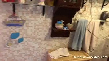 Волосатый самец после работы вернулся домой и сразу захотел трахнуть супругу. Найдя сучку на туалете парень стал ходить за дамой и просить о сексе. Вскоре мужчина не выдержал, нагло скинул штаны потаскушке и отодрал любимую жену на кухне. После ребята ускорились и довольный хлопец закончил сношение мощным выстрелом спермы в писю партнёрше.